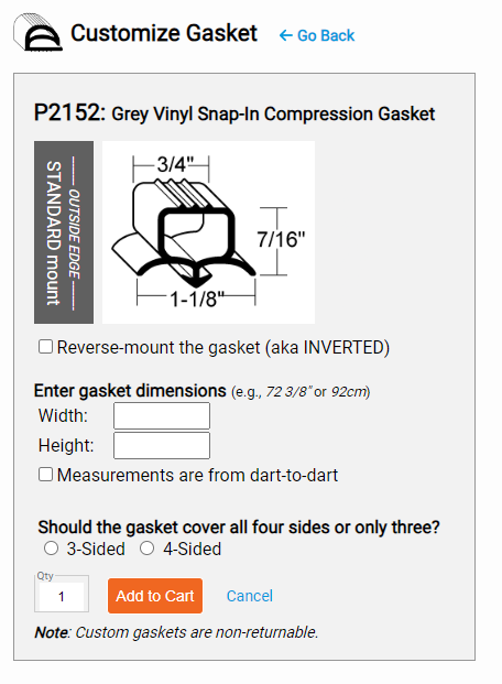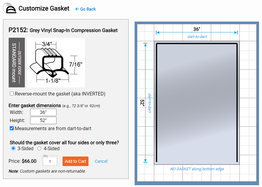 Once you enter your specifications, you immediately see pricing and are given the option to order your custom gasket.